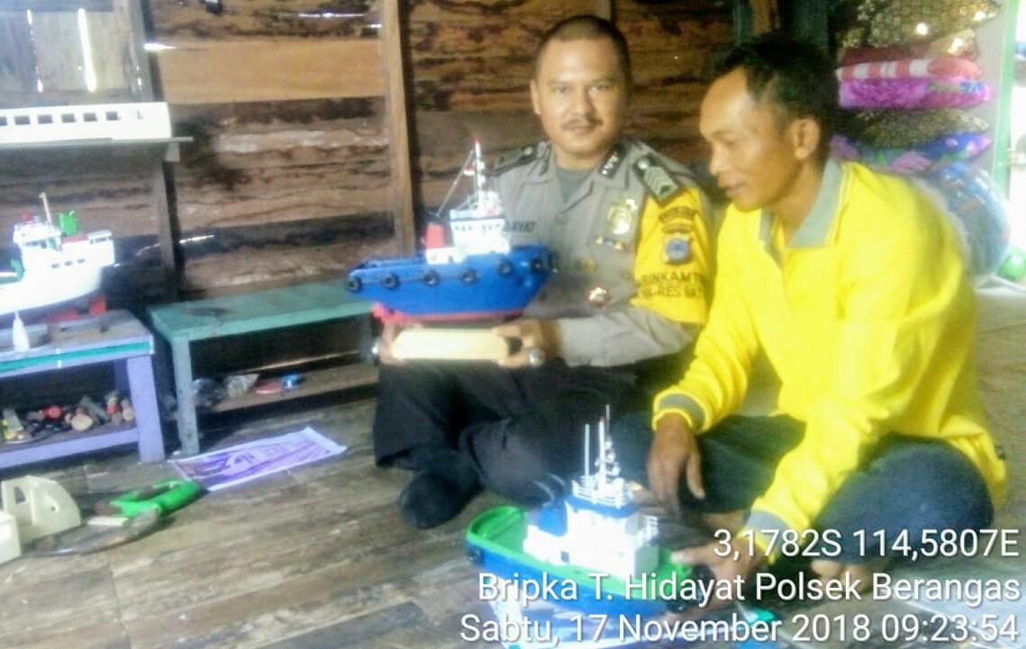 SUARA BANUA NEWS.Com-BATOLA–Bhabinkamtibmas Bripka Taufik Hidayat dan aparatur desa Balandean Muara Kecamatan Alalak Kabupaten Barito Kuala, mengunjungi Sanang, seorang pengrajin miniatur kapal.yang juga warga Balandean Muara, Sabtu (17/11/2018)