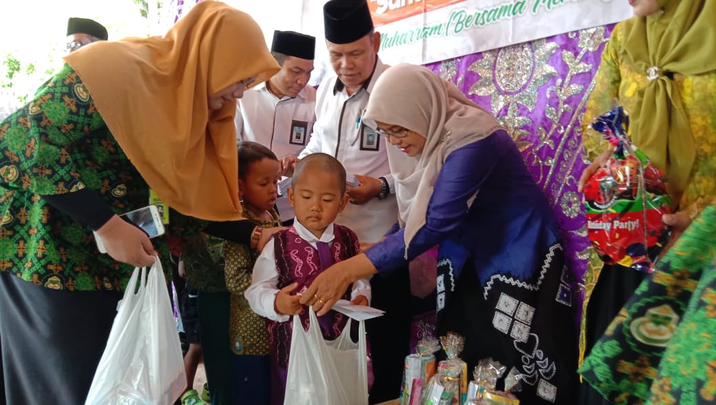 Sebagaimana tema acara ‘Gema Muharram 1441 Hijriah’, dipenghujung acara Kakandepag kota Banjarbaru dan ketua Dharma Wanita Persatuan Kantor Kementerian Agama Kota Banjarbaru Hj. Rosita Humaidi membagikan santunan kepada ratusan anak yatim.
