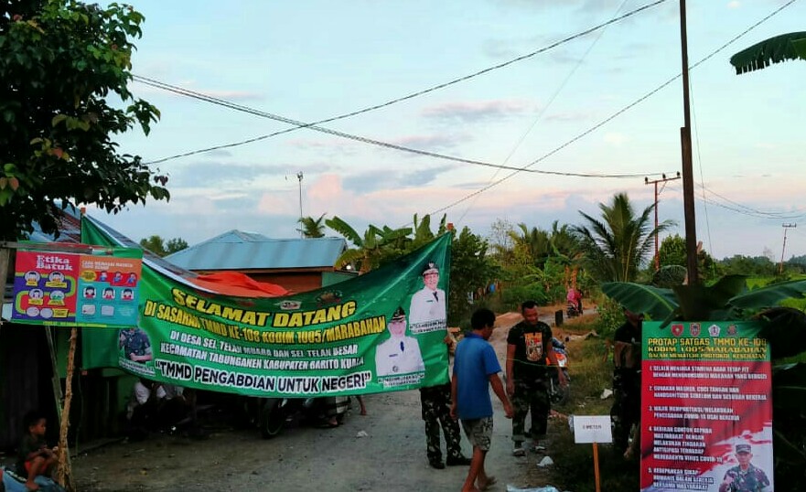 suara banua news- MARABAHAN, Menyambut acara pembukaan TNI Manunggal Membangun Desa (TMMD) ke-108 Kodim 1005 Marabahan, yang rencananya akan berlangsung Selasa,(30/6/2020), Satgas TMMD dan warga mulai memasang sejumlah umbul-umbul dan baliho di lokasi lapangan Makoramil 1005-11/Tabunganen.