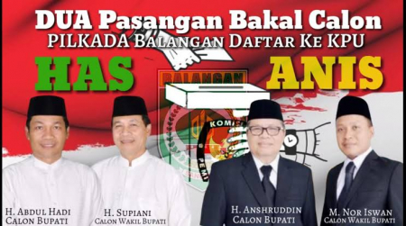 DUA PASANG calon yang itu masing-masing Abdul Hadi – Supiani (HAS) dengan nomor urut 1 dan Ansharuddin- Iswan (ANIS) dengan nomor urut 2.