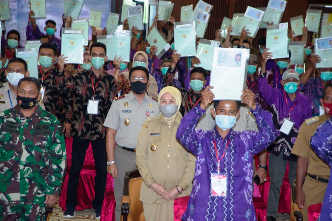 NOORMILIYANI menghadiri penyerahan sertipikat secara virtual di Gedung Idham Chalid Komplek Gubernuran Banjarbaru ini dalam rangkaian Hari Agraria dan Tata Ruang Nasional.