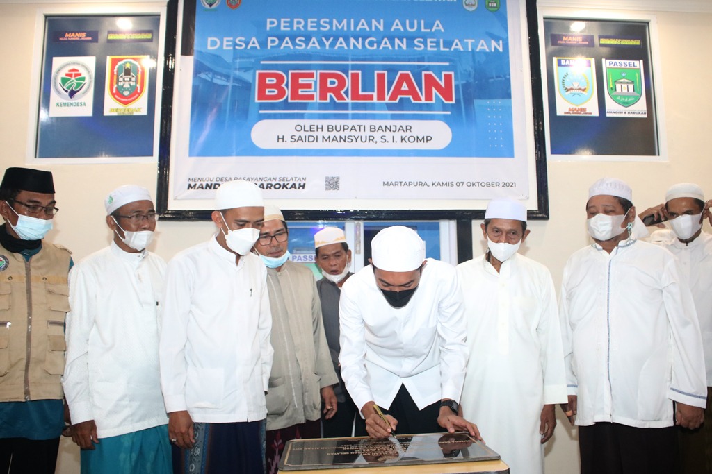suara banua news – MARTAPUTA, Bupati Banjar H. Saidi Mansyur menandatangani prasasti sebagai tanda diresmikannya Aula Serbaguna Berlian Desa Pasayangan Selatan Kecamatan Martapura , Kabupaten Banjar , Kamis (7/10/2021) malam.