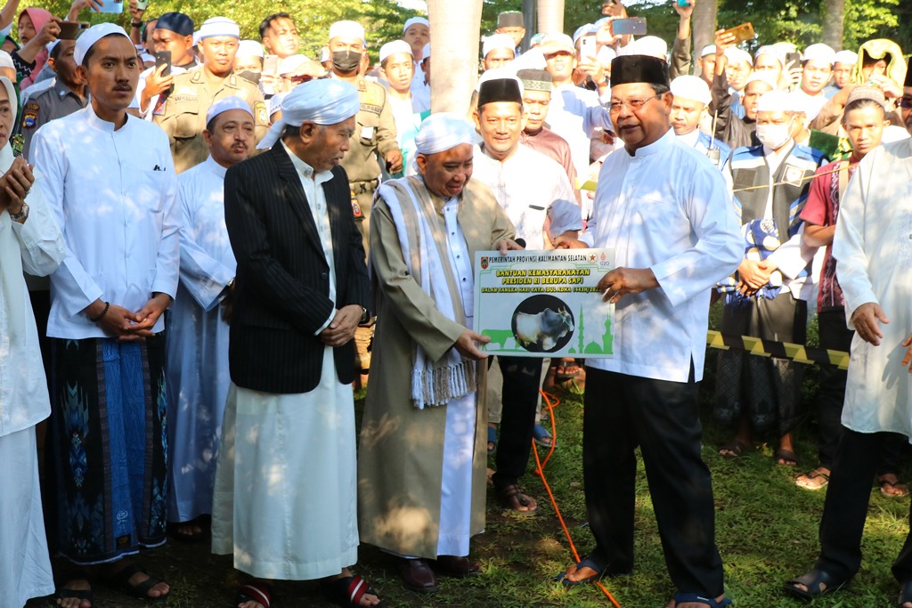 suara banua news – MARTAPURA, Gubernur Kalimantan Selatan H.Sahbirin Noor menyerahkan sapi kurban bantuan Presiden RI kepada Pengurus Masjid Al Karomah Martapura.