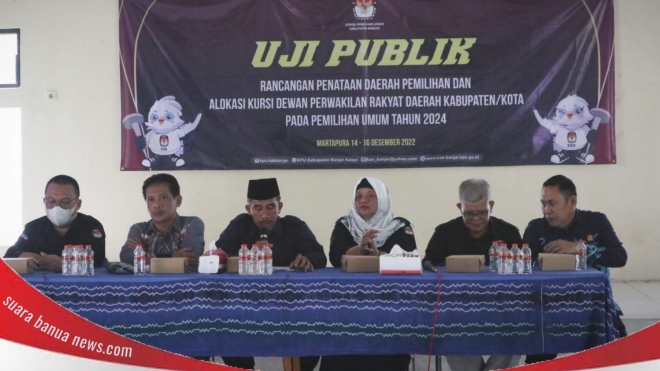 suara banua news -MARTAPURA, Komisi Pemilihan Umum (KPU) Kabupaten Banjar melakukan uji publik soal rancangan penataan daerah pemilihan dan alokasi kursi DPRD Kabupaten Banjar pada pemilu 2024 mendatang.