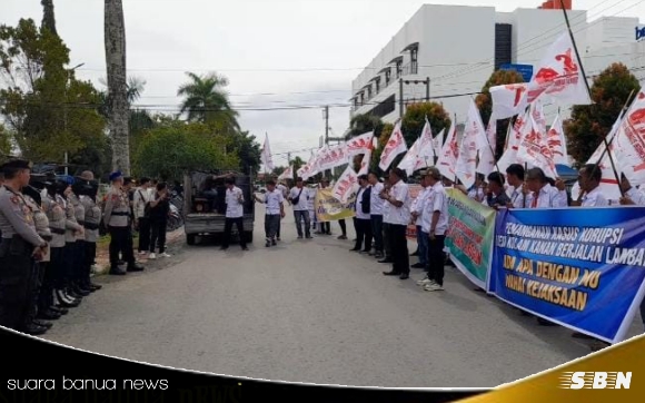 suara banua news- MARABAHAN, Massa DPP Serikat Buruh Nasionalis Indonesia (SBNI) Kalimantan Selatan, menggelar aksi damai dimuka gedung Kejaksaan Negeri Batola, Senin 10 Februari 2025.