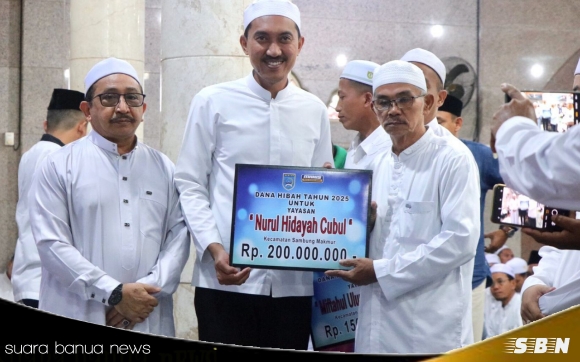 PIMPINAN kepala daerah Kabupaten Banjar ini, bersilaturahmi dengan masyarakat setempat di Masjid Jami Nurul Huda, sekaligus menyerahkan bantuan hibah bidang keagamaan kepada 8 yayasan Pondok Pesantren (PP)