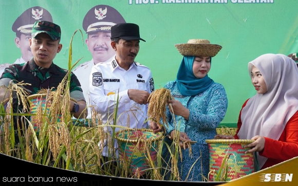 suara banua news -KARANG INTAN, Bupati Banjar, H. Saidi Mansyur, bersama Ketua TP PKK Hj. Nurgita Tiyas, turut serta dalam panen padi dan syukuran di Desa Awang Bangkal Barat, Kecamatan Karang Intan, Rabu 14 Mei 2025.