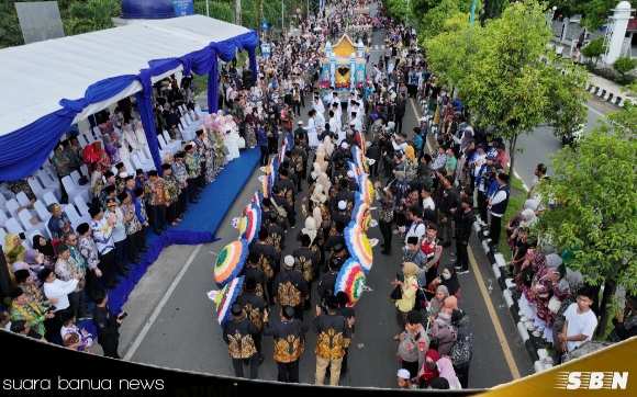 suara banua news-MARTAPURA, Pawai Taaruf yang spektakuler menandai dimulainya Musabaqah Tilawatil Qur’an (MTQ) Nasional XXXVI tingkat Provinsi Kalimantan Selatan, Sabtu 21 Juni 2025, lebih dari 1.000 peserta dari 13 kabupaten/kota di Kalsel berpartisipasi dalam pawai yang meriah di Jalan A Yani, Martapura, di depan CBS Martapura.