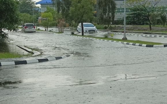 PENGAMATAN di lokasi menunjukkan bahwa genangan air cukup dalam, terutama di bagian depan area kampus ULM.