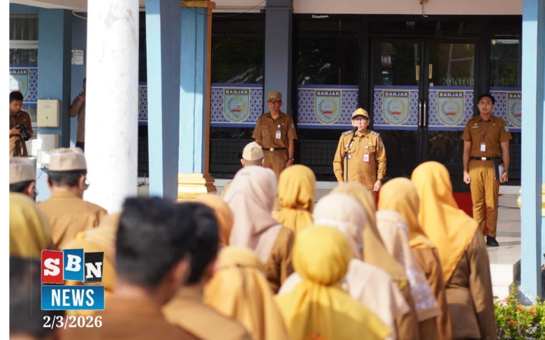 sbn-MARTAPURA, Pemerintah Kabupaten Banjar melaksanakan Apel Gabunga di Halaman Kantor Bupati Martapura pada pagi hari. Plh Setda Banjar H Ikhwansyah bertindak sebagai Pembina apel bersama petugas dari Dinas Perpustakaan dan Kearsipan (Dispersip).