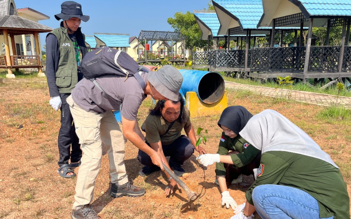 Selain menanam bibit durian, pinang, dan tanaman lokal lainnya, para peserta juga melakukan aksi bersih-bersih (clean up).