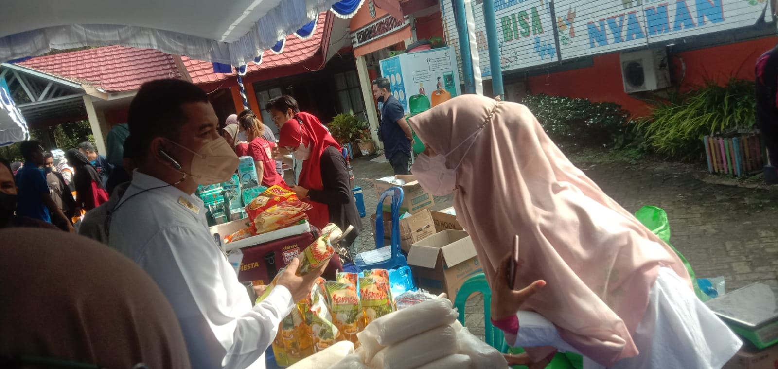 suara banua news-BANJARMASIN, Ratusan Ibu Rumah Tangga (IRT) serbu pasar murah yang menjual kebutuhan pokok diantaranya minyak goreng dan gula, Rabu pagi (2/2/2022) di halaman kantor Camat Banjarmasin Utara.